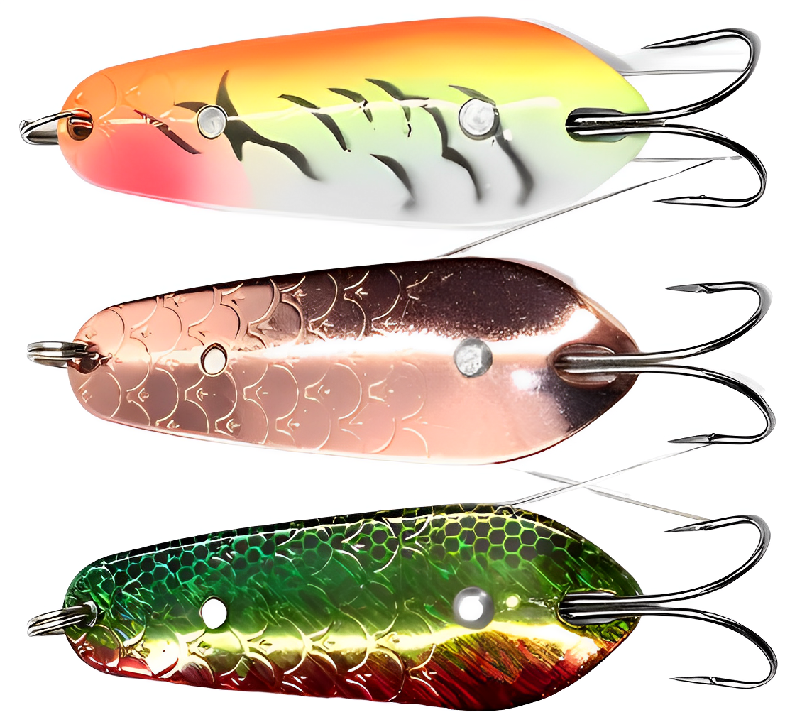 •  Узкие. Коэффициент отношения длины к ширине — более 3,5. Узкие «колебалки» идеально подходят для ловли на течении и при быстрой проводке. Они не срываются во вращение при быстрой проводке, и их колебательные движения достаточно размашисты. Однако активность и амплитуда колебаний сильно зависят от скорости и вида проводки. Угол отклонения задней части приманки может достигать 45 градусов и выше. Часто можно услышать обобщённое название таких узких и вытянутых блесен — «Ивовый лист».
